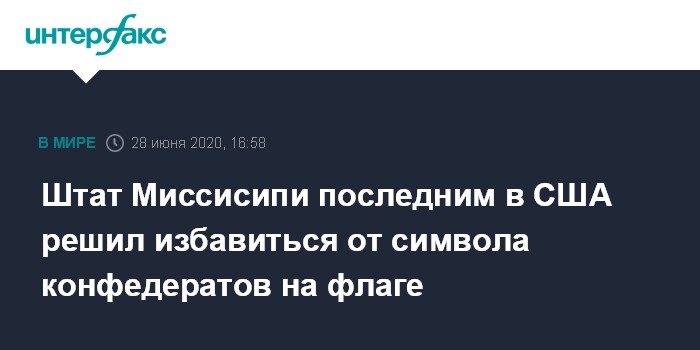 Москва. 28 июня. INTERFAX.RU - Власти штата Миссисипи сделали серьезный шаг на пути изменения флага, на котором пока еще присутствует символика Конфедерации южных штатов, сообщает "Би-би-си".