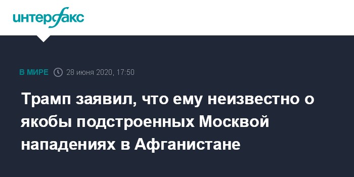 "Никто не предоставлял информацию и не говорил ни мне, ни вице-президенту Пенсу или главе аппарата Марку Медоузу о так называемых атаках на наши войска в Афганистане со стороны русских, как об этом со ссылкой на "анонимные источники" сообщало это фейковое СМИ "Нью-Йорк таймс". Все это отвергают и было не так уж много нападений на нас..." - написал Трамп в твиттере