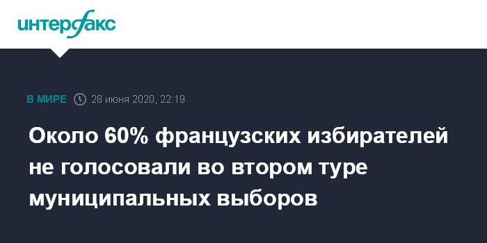 Москва. 28 июня. INTERFAX.RU - Исторически низкой называют французские СМИ явку избирателей на второй тур муниципальных выборов, который состоялся во Франции в воскресенье.
