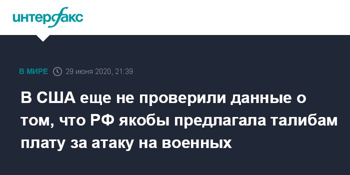 Москва. 29 июня. INTERFAX.RU - Разведслужбы США все еще проверяют информацию СМИ о том, что российская военная разведка якобы предлагала талибам (движение "Талибан", запрещенная в РФ террористическая организация) вознаграждение за нападения на американских военнослужащих в Афганистане, сообщили в понедельник на брифинге в Белом доме.