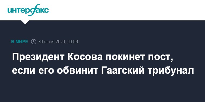 Москва. 29 июня. INTERFAX.RU - Президент Косово Хашим Тачи заявил во время обращения к нации в понедельник, что уйдет в отставку, если обвинения в преступлениях против человечности, озвученные в его адрес на прошлой неделе, останутся в силе, сообщила The Financial Times.