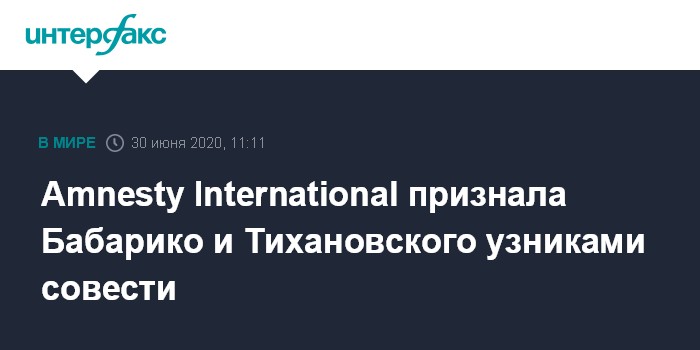 Москва. 30 июня. INTERFAX.RU - Международная организация Amnesty International признала Виктора и Эдуарда Бабарико, Сергея Тихановского, а также ряд их соратников и блогеров, задержанных ранее в Белоруссии, узниками совести.