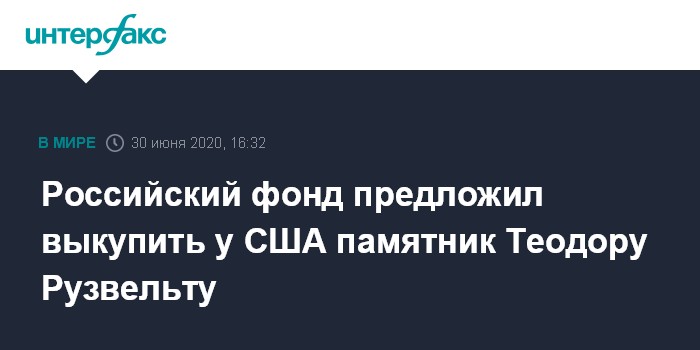 Москва. 30 июня. INTERFAX.RU - Фонд Art Russe, основанный российским бизнесменом Андреем Филатовым, предложил выкупить памятники президенту США Теодору Рузвельту и правителю русских поселений в Северной Америке Александру Баранову, которые собираются демонтировать. Директор фонда Рена Лавери направила эти предложения властям Нью-Йорка и Ситки (Аляска).