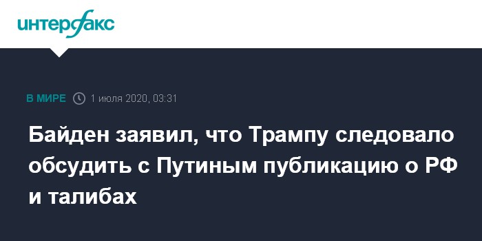 Москва. 1 июля. INTERFAX.RU - Президенту США Дональду Трампу нужно было обсудить с российским коллегой Владимиром Путиным изложенные в публикации The New York Times данные о предполагаемом сговоре РФ с представителями "Талибана" (движение запрещено в РФ), заявил вероятный кандидат в президенты США от демократов Джо Байден.