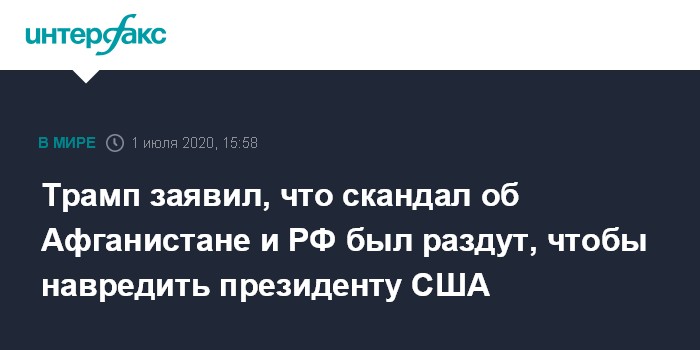 Москва. 1 июля. INTERFAX.RU - Сообщения СМИ о том, что РФ якобы предлагала движению "Талибан" (запрещено в России) убивать американцев в Афганистане за вознаграждение, является попыткой навредить Республиканской партии и лидеру США, заявил американский президент Дональд Трамп.