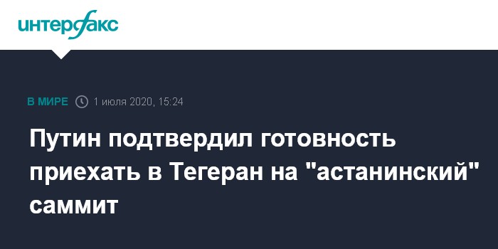 Москва. 1 июля. INTERFAX.RU - Президент России Владимир Путин подтвердил готовность приехать в Тегеран на очный саммит в "астанинском формате", как только появится возможность.