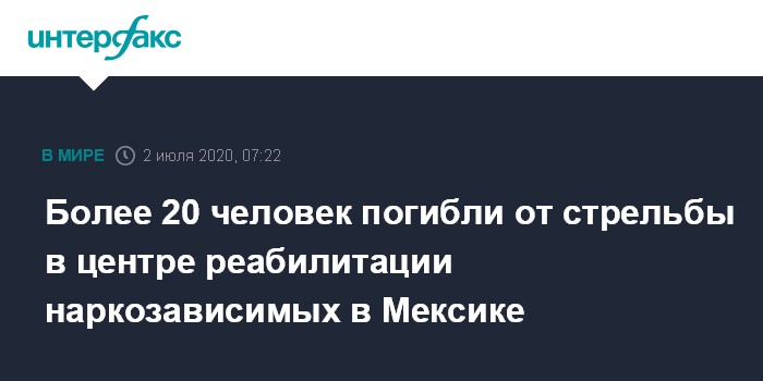 Москва. 2 июля. INTERFAX.RU - В результате стрельбы, устроенной в центре реабилитации наркозависимых в Мексике, погибли 24 человека, еще семь человек получили ранения, сообщило агентство Associated Press.
