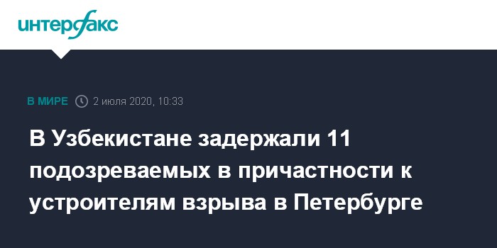 Москва. 2 июля. INTERFAX.RU - Правоохранительные органы Узбекистана задержали 11 человек по подозрению в принадлежности к террористической группировке "Катиба Таухид валь-Джихад" (запрещена в РФ и в Узбекистане), стоявшей за взрывом в метро в Санкт-Петербурге весной 2017 года.