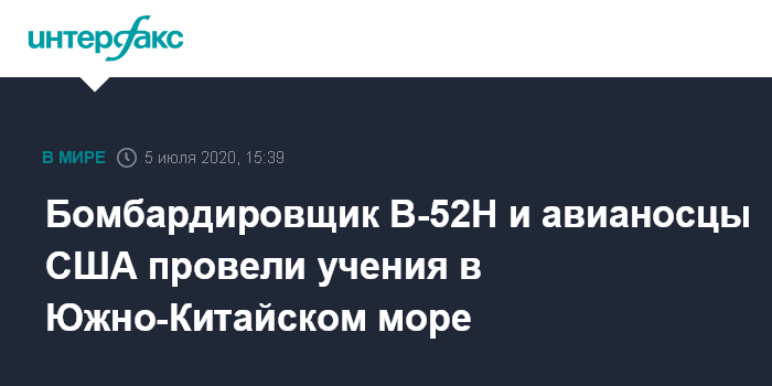 Москва. 5 июля. INTERFAX.RU - Американский стратегический бомбардировщик B-52H и палубная авиация двух авианосцев Nimitz и Ronald Reagan провели совместные учения над Южно-Китайским морем, сообщило в воскресенье командование ВВС США на Тихом океане.