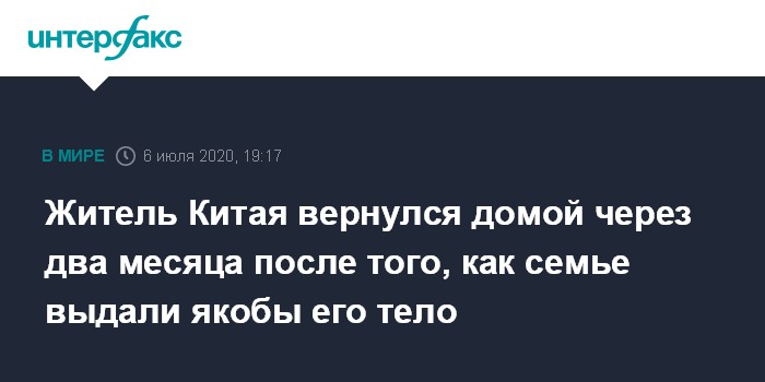 Москва. 6 июля. INTERFAX.RU - Житель Китая, о смерти которого родственникам сообщили врачи, через два месяца вернулся домой, шокировав семью.