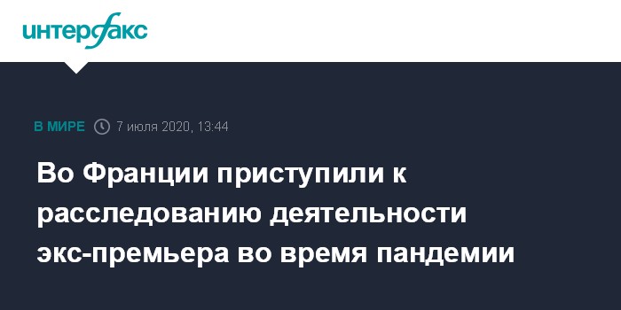 Москва. 7 июля. INTERFAX.RU - Генпрокурор кассационного суда Франции Франсуа Молен во вторник объявил о начале предварительного расследования в отношении ушедшего в июне с поста премьер-министра Эдуара Филиппа по поводу работы его правительства во время пандемии коронавируса, сообщают французские СМИ.