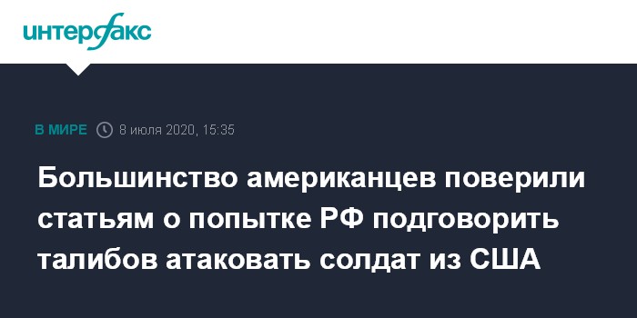 Москва. 8 июля. INTERFAX.RU - Большинство американцев полагает, что Россия действительно подкупала членов радикальной группировки "Талибан" (запрещена в РФ) в Афганистане, чтобы те атаковали солдат из США, сообщают американские СМИ со ссылкой на опрос Ipsos.