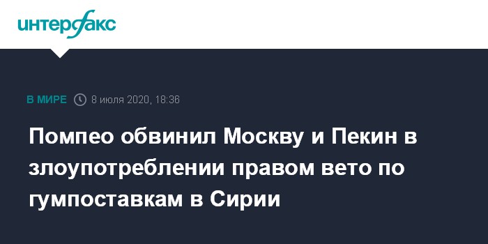 Москва. 8 июля. INTERFAX.RU - Россия и Китай злоупотребляют правом вето в СБ ООН ради сотрудничества с президентом Сирии Башаром Асадом, в силу чего необходимо увеличить плату за их действия, заявил в среду госсекретарь США Майк Помпео.
