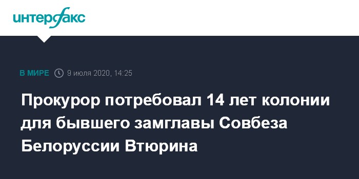 Москва. 9 июля. INTERFAX.RU - Гособвинитель запросил у Московского суда Минска 14 лет колонии усиленного режима для бывшего заместителя госсекретаря Совета безопасности Белоруссии Андрея Втюрина за получение взятки и подстрекательство к даче взятки, передает "БелТА". Также он потребовал лишить подсудимого звания полковника.