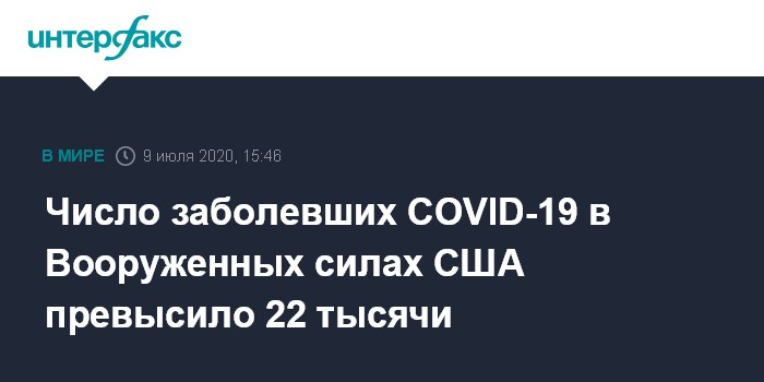 Москва. 9 июля. INTERFAX.RU - Количество заболевших коронавирусом в Вооруженных силах США достигло 22 168 человек, следует из данных Пентагона.
