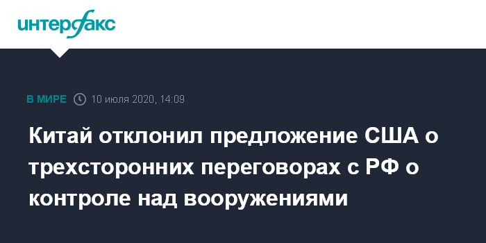 Москва. 10 июля. INTERFAX.RU - Власти Китай в пятницу заявили, что не собираются принимать приглашение США начать трехсторонние переговоры с Россией о контроле над вооружениями, передают западные СМИ.