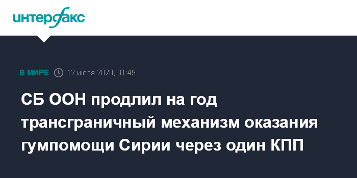 10 июля, в пятницу, Россия и Китай вновь наложили вето на второй проект резолюции СБ ООН Германии и Бельгии по продлению механизма трансграничной помощи на полгода - до 10 января 2021 года - через два КПП "Баб Аль-Салам" и "Баб Аль-Хава". В пятницу же второй российский проект по продлению механизма на год через один погранпереход также не набрал необходимое для принятия числа голосов.