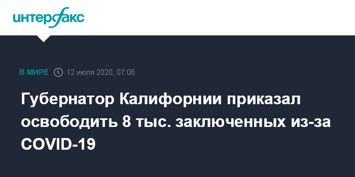 Москва. 12 июля. INTERFAX.RU - Во избежание распространения коронавирусной инфекции в тюрьмах губернатор штата Калифорния Гэвин Ньюсом распорядился освободить 8 тыс. заключенных.