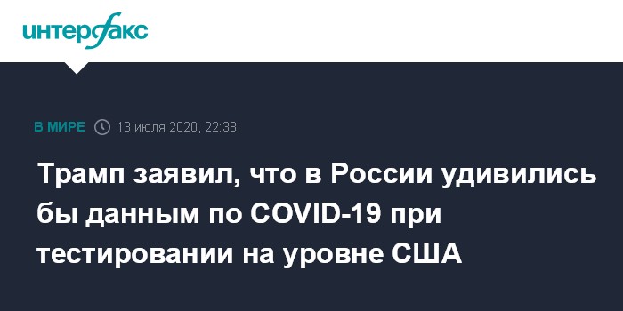Москва. 13 июля. INTERFAX.RU - В ряде больших стран, в частности, в России, получили бы иную, менее оптимистичную, картину распространения COVID-19, если бы тестировали людей столь же интенсивно, как в США, заявил в понедельник президент США Дональд Трамп.