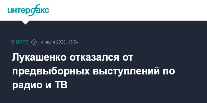 Москва. 14 июля. INTERFAX.RU - Действующий глава Белоруссии Александр Лукашенко отказался от выступлений по государственному радио и телевидению в рамках текущей кампании по выборам президента республики, сообщила заведующая правовой, аналитической и методической работой Центризбиркома Галина Мкртчян.