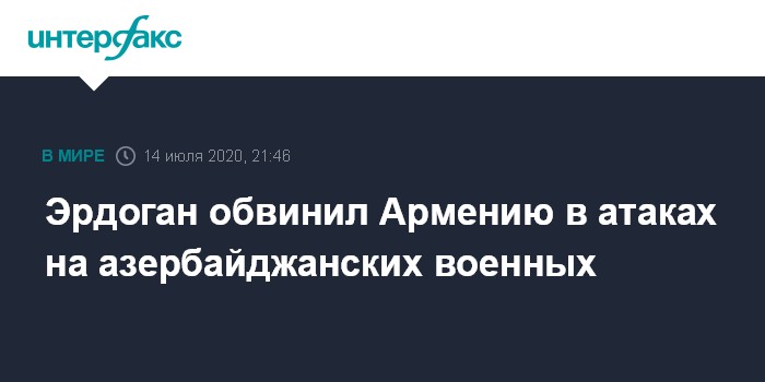 Москва. 14 июля. INTERFAX.RU - Президент Турции Реджеп Тайип Эрдоган во вторник заявил, что, по его мнению, в нарушении прекращения огня на азербайджано-армянской границе виновны ВС Армении, сообщает агентство "Анадолу".