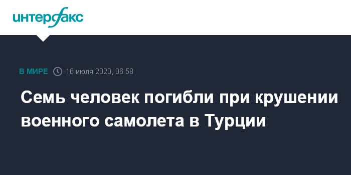 Москва. 16 июля. INTERFAX.RU - Семь сотрудников службы безопасности Турции погибли в результате крушения разведывательного самолета, сообщило агентство "Анадолу" со ссылками на министерство внутренних дел страны.