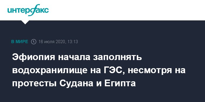 Москва. 16 июля. INTERFAX.RU - Водохранилище, образованное гигантской плотиной ГЭС "Великое эфиопское возрождение" на Ниле, уже заполняется, заявляют власти Эфиопии.