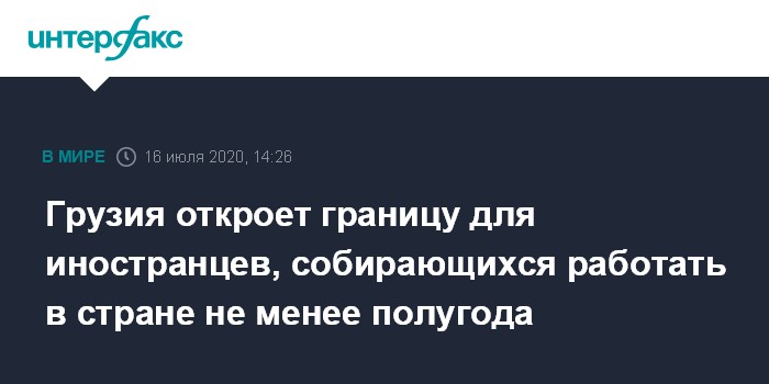 Москва. 16 июля. INTERFAX.RU - Межведомственный координационный совет по борьбе с COVID-19 при правительстве Грузии принял решение разрешить въезд всем иностранным бизнесменам и самозанятым гражданам, которые намерены провести в Грузии не менее шести месяцев, сообщила в четверг журналистам глава Минэкономразвития Грузии Натия Турнава.