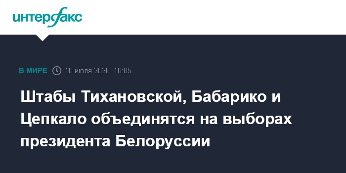Москва. 16 июля. INTERFAX.RU - Кандидат в президенты Беларуси Светлана Тихановская объединяется со штабами экс-претендентов на президентский пост Виктора Бабарико и Валерия Цепкало.