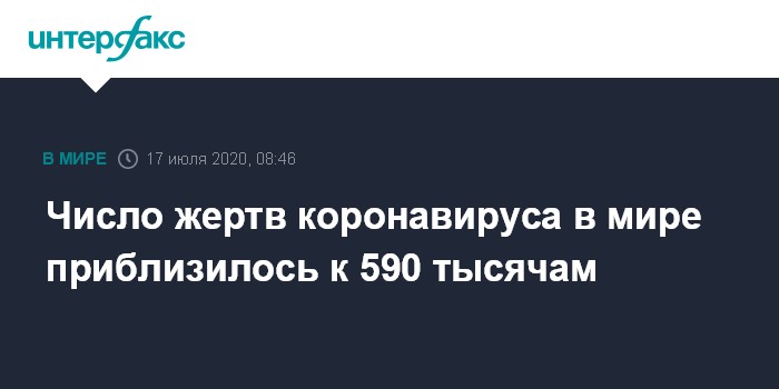 Москва. 17 июля. INTERFAX.RU - Число скончавшихся от связанных с коронавирусом заболеваний в мире достигло 589 211 человек, увеличившись за сутки на 5 087 человек, сообщил американский университет Джонса Хопкинса.