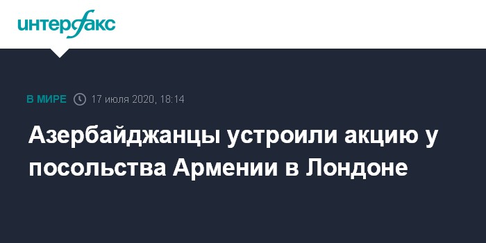 Москва. 17 июля. INTERFAX.RU - В Лондоне 150 уроженцев Азербайджана устроили акцию протеста у посольства Армении, сообщили в азербайджанском посольстве. Протестующие осудили действия армянских военных на границе с Товузовским районом Азербайджана.