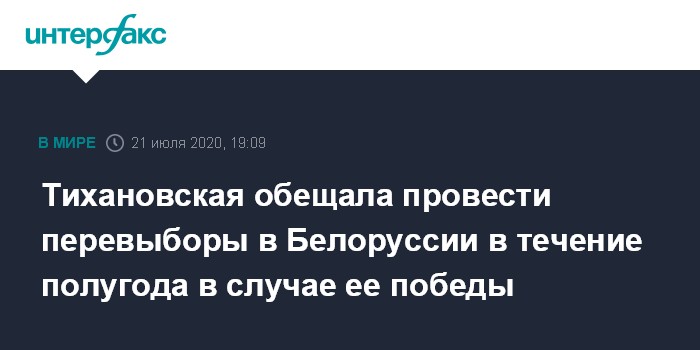 Москва. 21 июля. INTERFAX.RU - Кандидат в президенты Беларуси Светлана Тихановская заявила, что в случае ее победы в течение полугода в стране будут проведены новые честные, справедливые и открытые выборы.