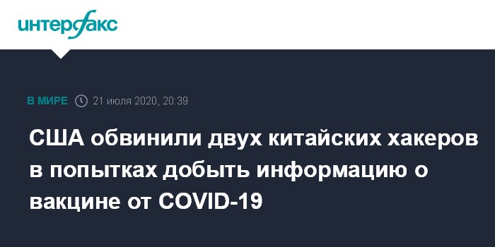 Москва. 21 июля. INTERFAX.RU - Министерство юстиции США предъявило обвинения в краже коммерческих секретов и мошенничеству двум гражданам КНР, которые, по версии следствия, пытались получить доступ к компьютерным сетям американских компаний, работающих над вакциной от коронавируса. Об этом сообщает агентство Associated Press (AP).
