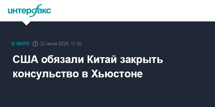 Москва. 22 июля. INTERFAX.RU - Власти США распорядились закрыть консульство Китая в Хьюстоне в штате Техас. Об этом сообщает в среду агентство Bloomberg со ссылкой на МИД Китая.