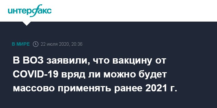 Москва. 22 июля. INTERFAX.RU - Во Всемирной организации здравоохранения (ВОЗ) полагают, что вакцина от коронавируса не будет массово применяться по меньшей мере до 2021 года.