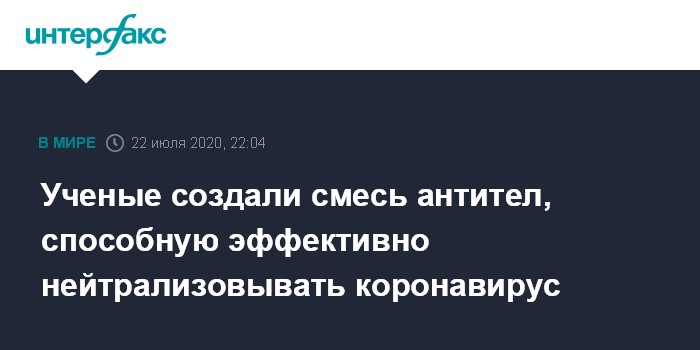 Москва. 22 июля. INTERFAX.RU - Ученым удалось создать смесь антител, которая сможет эффективно помочь в борьбе с коронавирусом и защитить людей, пишет в среду британская газета The Guardian.