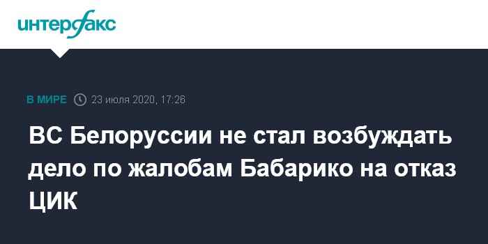 "Отказать в возбуждении гражданского дела по жалобам Виктора Бабарико на постановление Центральной комиссии республики Белорусии по выборам и проведению республиканских референдумов от 14 июля 2020 года №92 об отказе в регистрации кандидатом в президенты", - говорится в решении ВС, опубликованном на сайте суда в четверг.