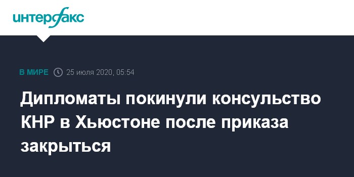 Москва. 25 июля. INTERFAX.RU - Китайские дипломаты в пятницу днем освободили здание консульства КНР в американском Хьюстоне (штат Техас) после того, как власти США во вторник дали им 72 часа на закрытие диппредставительства, сообщает Associated Press.