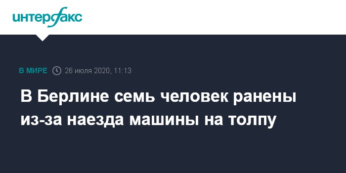 Москва. 26 июля. INTERFAX.RU - Автомобиль врезался в Берлине в воскресенье утром в группу людей, семь человек ранены, сообщили в правоохранительных органах.