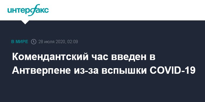 Москва. 28 июля. INTERFAX.RU - Комендантский час с 23:30 (00:30 мск) до 6:00 (7:00 мск) введен во всей бельгийской провинции Антверпен в связи с обострившейся эпидемиологической обстановкой, сообщает телеканал RTBF.