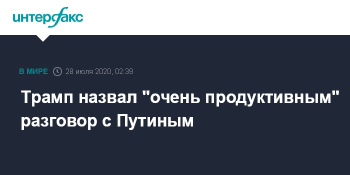 Москва. 28 июля. INTERFAX.RU - Президент США Дональд Трамп заявил, что его разговор с российским лидером Владимиром Путиным, состоявшийся 23 июля, был "очень продуктивным".
