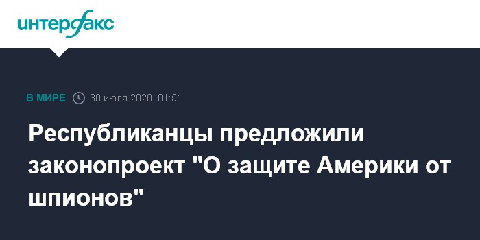Москва. 30 июля. INTERFAX.RU - Сенаторы-республиканцы вносят законопроект, который позволит госдепартаменту США отказывать в выдаче виз лицам, которые совершают акты шпионажа и кражи интеллектуальной собственности против Америки.