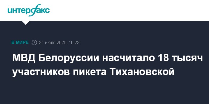 Москва. 31 июля. INTERFAX.RU - В предвыборном пикете кандидата в президенты Белоруссии Светланы Тихановской 30 июля в Минске приняли участие чуть больше 18 тысяч человек, сообщает МВД республики.