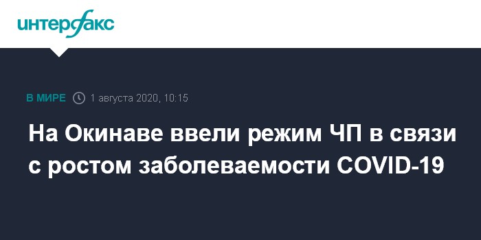 Москва. 1 августа. INTERFAX.RU - На территории японской префектуры Окинава введен режим чрезвычайного положения в связи с ухудшением эпидемиологической ситуации, сообщает японская пресса со ссылкой на губернатора провинции Дэнни Тамаки.