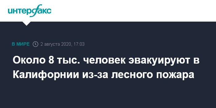 Москва. 2 августа. INTERFAX.RU - Более 7,8 тыс. жителей южных районов штата Калифорния, по состоянию на вечер субботы, получили приказ покинуть свои дома, с лесным пожаром, охватившим 20 кв. км, продолжают бороться 375 пожарных, сообщили власти.
