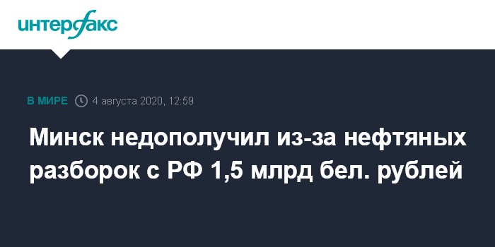Москва. 4 августа. INTERFAX.RU - Бюджет Белоруссии недополучил из-за спора вокруг поставок российской нефти в республику 1,5 млрд белорусских рублей (45,53 млрд рублей), заявил президент Белоруссии Александр Лукашенко.