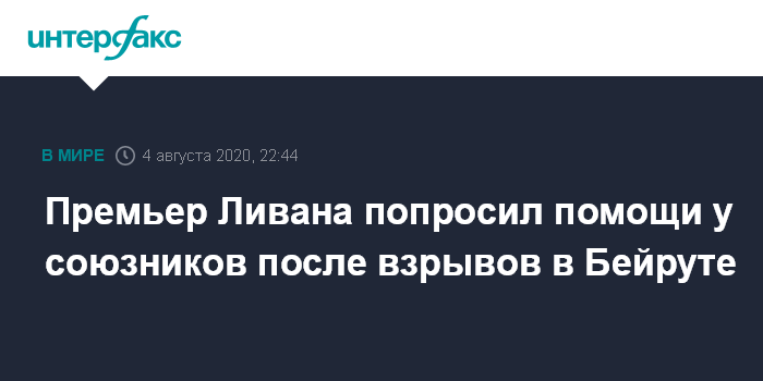 Москва. 4 августа. INTERFAX.RU - Премьер-министр Ливана Хасан Диаб призвал "дружественные государства" к помощи после серии разрушительных взрывов в порту Бейрута, сообщил телеканал Sky News.