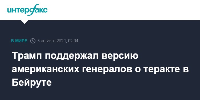 Москва. 5 августа. INTERFAX.RU - Президент США Дональд Трамп считает, что серия взрывов в Бейруте действительно была нападнением.