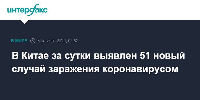 Москва. 5 августа. INTERFAX.RU - За истекшие сутки в Китае выявлен 51 новый инфицированный COVID-19: 27 больных в активной форме и 24 бессимптомных носителя, сообщил Госкомздрав КНР на своем официальном сайте.