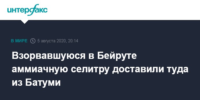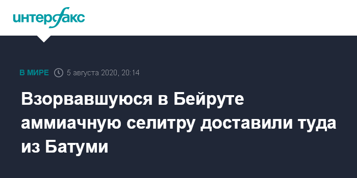 Москва. 5 августа. INTERFAX.RU - Аммиачная селитра, ставшая вероятной причиной взрыва в Бейруте, была доставлена туда в 2013 году из порта Батуми на сухогрузе Rhosus, следовавшем под молдавским флагом, сообщили в Агентстве морского транспорта Грузии. Груз - 2750 тонн селитры - предназначался Мозамбику.